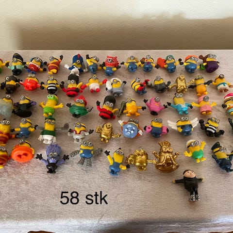Minions små figurer samling med 58 stk. Forskellige udgaver af Minions-figurer i flere farver og kostumer, enkelte med andre karakterer fra universet. Figurerne er små og egner sig til leg, samling eller som pynt. Leveres som samlet parti som vist på billederne.