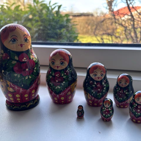 Sæt med 7 babushka dukker i træ. Dukkerne er håndmalede med blomsterdekorationer i flere farver. De kan placeres inde i hinanden fra største til mindste dukke.