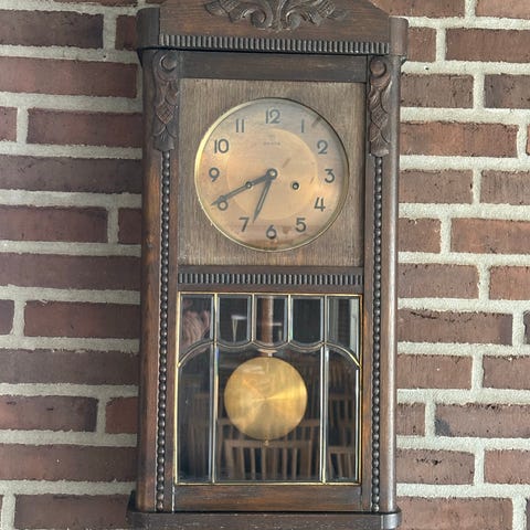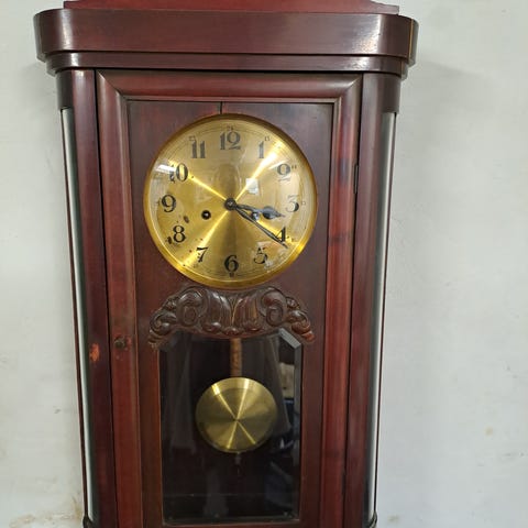 Vægur med pendul i mørkt træ. Uret har klassisk analog urskive med arabertal. Kabinettet er udført i træ med glasrude foran pendulet. Egnet som vægmonteret ur i stue.