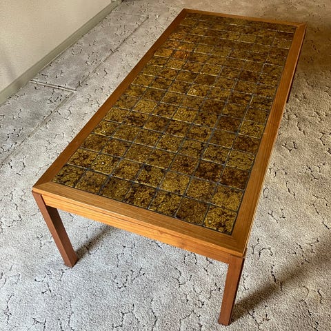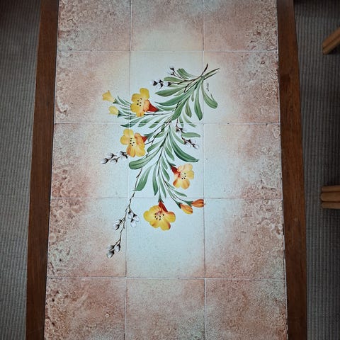 Flot og dekorativ kakkel sofabord. Virkelig flot motiv på kaklerne. Bordet har kraftige træben og en hylde under bordpladen til opbevaring. Bordender med lille klap som kan slås ned. Velegnet som sofabord eller sidebord i stue eller opholdsrum, hvor der ønskes et bord med dekorativt naturmotiv på pladen.