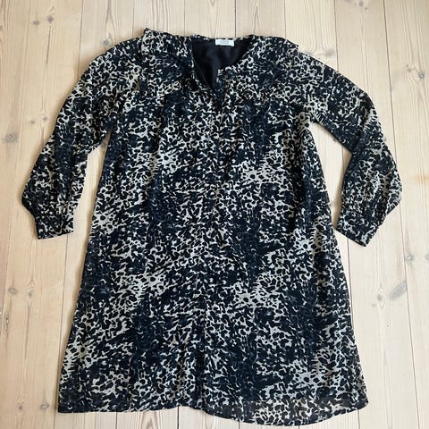 Smuk mønstret kjole med lange ærmer og knapper foran. Kjolen har et løst fald og en flæsekant nederst, der giver den et feminint udtryk. Perfekt til både hverdag og festlige lejligheder.