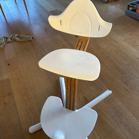 Stokke højstol i hvid og sort. Flot børnehøjstol med sæde, fodplade og bøjle samt bord og sele.