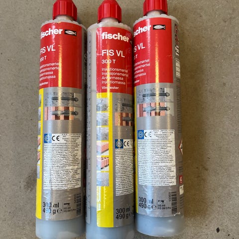 Fischer FIS V Plus 360 S injektionsmørtel i vinylester til kemisk fastgørelse. Patronstørrelse 360 ml. Anvendes til forankring af gevindstænger, armeringsjern og lignende i beton og murværk. Patronerne bruges sammen med blandedyser, som sikrer korrekt blanding af komponenterne ved udpresning. Egnede til både indendørs og udendørs konstruktionsopgaver, hvor der kræves høj bæreevne og lang holdbarhed. På etiketten er angivet brandmodstand R 120, seismisk klassificering C2 og op til 100 års beregnet levetid. Ud over patronerne ses blandedyser på billederne, som bruges til påføring af mørtlen i borehuller.