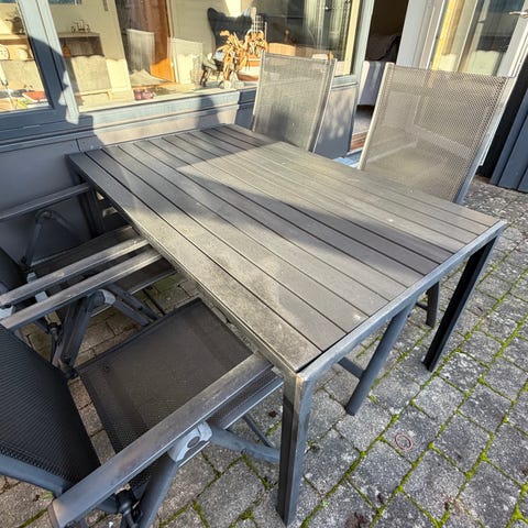 Havebord og -stol sæt i sort metal. 160 cm x 95 cm x 75 cm (l x b x h). Kan forlænges til 200 cm med udtræk. Seks stole med armlæn i teaktræ medfølger.