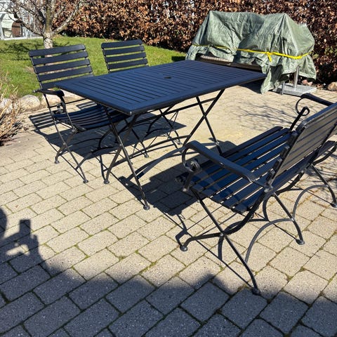 Havebord og stole sæt i metal i grøn farve.. Velegnet til brug på terrasse, altan eller have.