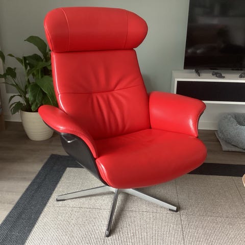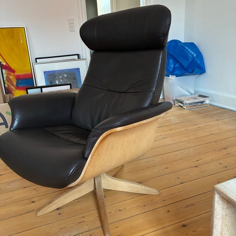 Timeout lænestol fra conform med tilhørende puf. Betrukket med sort læder samt lyst træ på bunden. Læder fremstår pænt. Der er nogle mærker på træ ved håndtag. (Se billede)