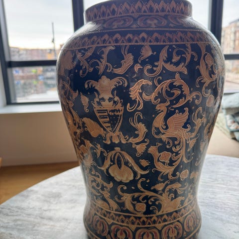 Kinesisk vase i porcelæn med flerfarvet dekoration. Vasen har et kantet, højformat design med motiver rundt om hele vasen. Egnet som gulvvase eller til placering på et stabilt underlag. Højde 63 cm, bredde 35 cm