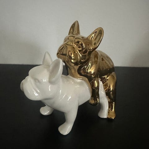 Sæt med to porcelænsfigurer formet som siddende hunde. Figurerne er hvide med håndmalede guldfarvede detaljer på pels, øjne og halskæde. De er udformet som spejlvendte makkerfigurer, så de kan stå som et par. Egnet som dekoration på hylde, reol eller vindueskarm i stue eller andre opholdsrum.