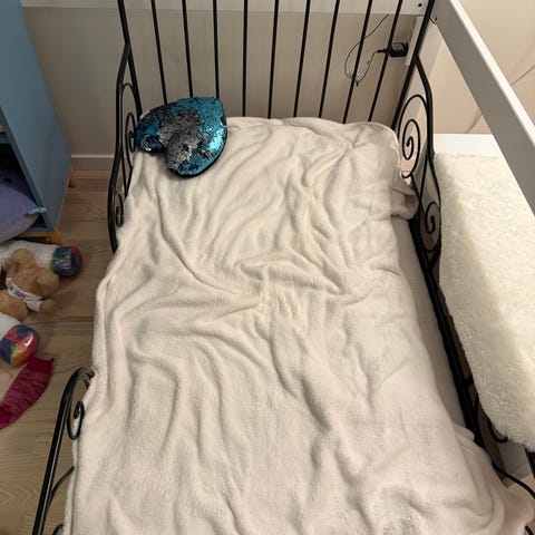 IKEA juniorudtræksseng i metal med sort stel. Sengen har sider med sprosser og dekorative buer i gavle og langs siderne. Velegnet som overgangsseng fra tremmeseng til almindelig seng til mindre børn.