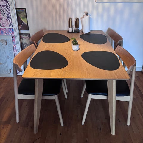Sælger dette stilfulde spisesæt bestående af et solidt spisebord i egetræs-look med en flot "live edge" naturkant og et sæt med fire matchende sorte stole. Det perfekte sæt til dig, der ønsker et moderne og varmt udtryk i spisestuen 🌸