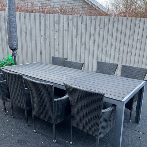 Havemøbelsæt bestående af rektangulært bord og tilhørende stole.