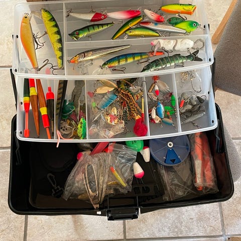 Mange forskellige fluer, flydere, lod, blink, kroge. Mange af de ekstra ting er helt nye, som i slet ikke åbnet.