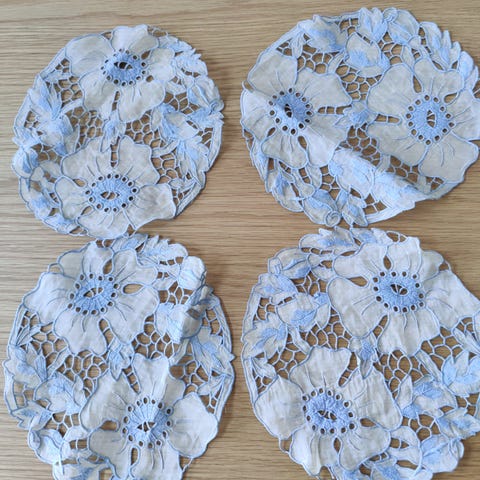 Broderede mellemlægsservietter med fine bærmotiver. Mønsterdesign højst sandsynligt af navnkundige Gerda Bengtsson for Haandarbejdets Fremme. Bemærk, at er broderet på to forskellige typer stof, og at enkelte små pletter forekommer. Håndarbejdet er nydeligt udført. Se ekstra fotos for stand. Mål ca. 15 x 15 cm. Også super fine til krea.