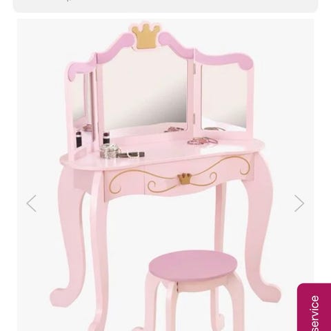 Kinderkraft sminkebord til børn i lyserød farve med tilhørende skammel. Bordet har tre spejle, hvor de to yderste kan vinkles, samt en skuffe til opbevaring af småting. Designet har buede ben og en dekorativ krone øverst. Velegnet som børnemøbel på børneværelset til leg og udklædning.