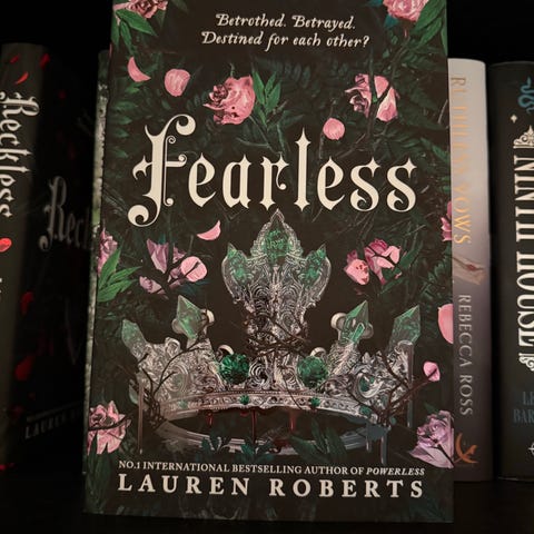 Lauren Roberts Powerless bog. Fantasyroman på engelsk med hårdt omslag (hardback). Omslaget har mørkt, illustreret design med lilla detaljer og indvendigt kort over bogens univers. Velegnet til læsere af engelsksproget fantasy.