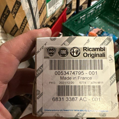 Alfa Romeo originale reservedel. På emballagen fremgår blandt andet delenummer 0050568890-001 og 6856 5223 AA-001 samt mærkning "Genuine Parts and Accessories".