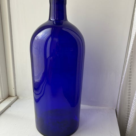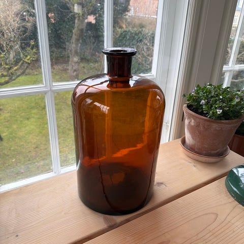 Stor grøn glasflaske anvendt som vase. Flasken er fremstillet i mørkegrønt glas og har en høj, cylindrisk form med smal hals. Egnet som gulvvase til grene, tørrede blomster eller dekorative arrangementer i hjemmet.