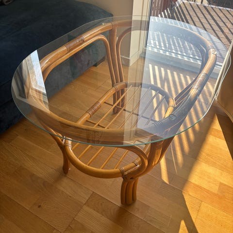Fint vintage sofabord i rattan/bambus med røgfarvet glasplade og hylde.