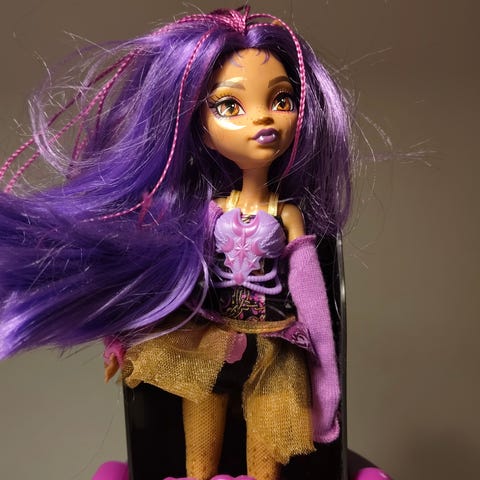 Monster High Clawdeen soveværelse med seng og tilbehør i lilla og pink farver. Sættet indeholder himmelseng med pelsagtigt sengetæppe, natbord, spejl formet som en kiste, stol, lille skammel og diverse små accessories. Passer til Monster High dukker og lignende modedukker i tilsvarende størrelse.