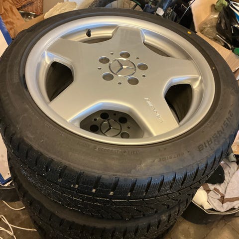 Originale AMG fælge inklusiv næsten nye Hankook vinterdæk . Kommer fra en Mercedes C63 AMG fra 2018 . Passer helt sikkert på en masse andre modeller . Fremstår i pæne brugt stand .