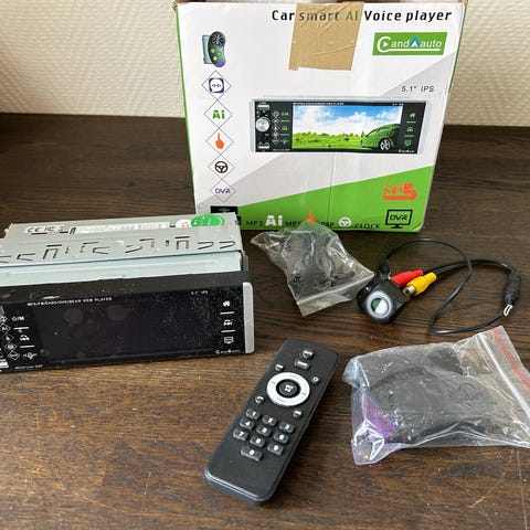 Bilradio multimedieafspiller og touchskærm. Enheden har frontmonteret drejeknap og betjeningsknapper samt USB- og AUX-indgang. Bagtil er der stik til strøm, højttalere og RCA-tilslutninger til f.eks. kamera eller ekstern lyd. Enheden understøtter afspilning af musik, radio og tilslutning af smartphone via kabel til skærmspejling. Leveres med ledningsnet, hornkabel, fjernbetjening til rat og USB-kabel som vist på billederne. Fysiske mål fremgår af måltegningen på billedet.