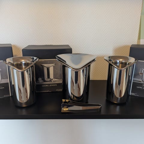 Denne isspand med tang er en del af serien Wine fra Georg Jensen. Serien er designet af Thomas Sandell og indeholder vin-relaterede produkter med et elegant, tidløst design. Isspanden er fremstillet af rustfrit stål i to lag med en isolerende effekt. 21 cm.