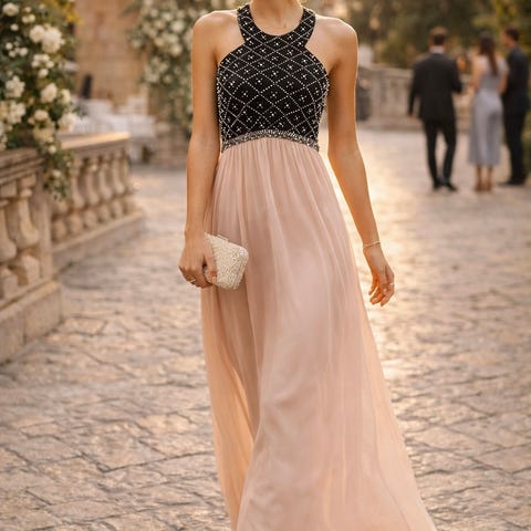 Chi Chi London maxikjole med smuk udsmykning. Sort perlebesat satinbody med polstring og elastik bagpå, derunder en lang, pudderfarvet nederdel i 2 lag (satin inderst, chiffon yderst - så ikke gennemsigtig).