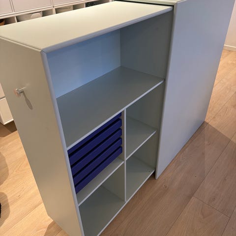 Smarte, praktiske Montana kontormoduler - geniale at have for enden af arbejdsbordet, til skjult opbevaring.