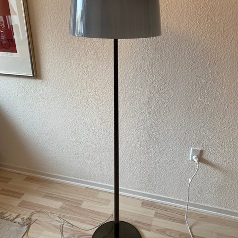 Sort lampefod med mørkegrå velour skærm. Fuld højde 90cm