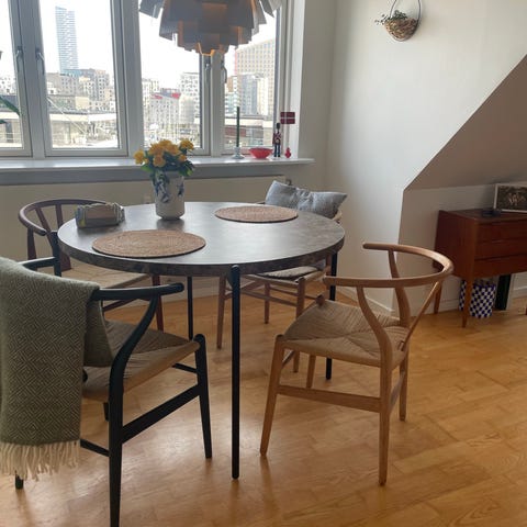 Zander – Rundt sort spisebord med marmor look på trompetfod Årsag til Outlet: Bordet har været udstillet i vores showroom. Der er små "brugsskrammer" på selve bordpladen. På siden af bordet er der et lille indhak og en fejl i marmor looket. (se billeder) - Da varen ingen emballage har, skal denne afhentes på vores lager. Dette elegante og moderne spisebord er det perfekte valg til ethvert hjem, der tilføjer en touch af luksus og stil til spisestuen. Bordet har en smuk mat sort finish med et realistisk marmor look i mat, det giver en sofistikeret og luksuriøst udtryk. Uanset om du bruger det til daglige måltider eller særlige lejligheder, vil dette Zander spisebord med marmor look være en imponerende tilføjelse til dit hjem. Det runde spisebord kan have 4 af vores spisebordsstole stående omkring. Bordpladen har en diameter på 100cm. Så der er plads til at have samtaler med familie eller venner hen over bordet. Bordpladen er let at rengøre, da den er lavet af holdbart materiale. Hvorfor vælge bord med trompetfod Runde spiseborde med trompetfødder er ret populære i moderne møbeldesign, da de giver et elegant og minimalistisk udseende. Trompetfoden giver en stabil og støttende base til bordet og skaber samtidig en følelse af lethed og elegance i designet. De er også praktiske, da trompetfoden giver mere plads til benene, og den runde form gør det lettere at tale med alle ved bordet. Så hvis du er på udkig efter et stilfuldt og praktisk spisebord med en trompetfod, så er vores runde sorte spiseborde i mat med marmor look et godt valg for dig! Produkter til vedligeholdelse og rengøring Guardian lakvask: Guardian Lakvask er specielt udviklet til rengøring, pleje samt beskyttelse af matte, lakerede overflader og kan anvendes på samtlige træsorter, se her.