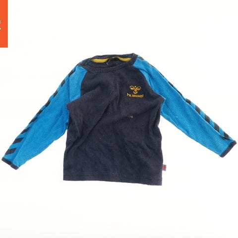 Langærmet bluse med striber i blå og grøn. Blusen har et ensfarvet mørkeblåt ærme på den ene side og mærket 'Hummel' trykt på det modsatte ærme.