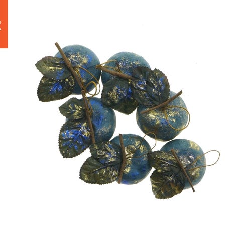 Et sæt af seks dekorative æbler malet i blå med guld detaljer. Æblerne har en struktureret overflade og er udstyret med gyldne blade og snore til ophængning. De er præsenteret i en rød kasse med mønster.