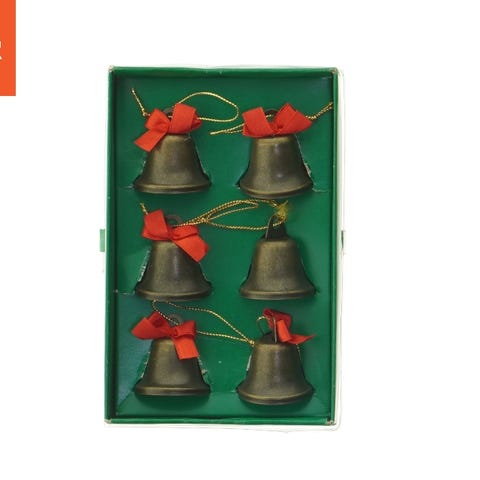 Et sæt af seks gyldne juleklokker lavet af metal. Hver klokke har et rødt bånd og er hængt op med en gylden snor. De er præsenteret i en grøn boks med røde konfetti-design.