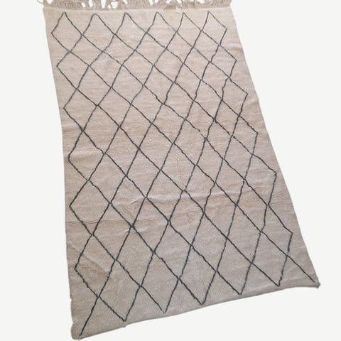Denne smukke Beni Ouarain-berbermåtte er en autentisk håndværksgenstand, fuldstændig vævet i hånden i Atlasbjergene i Marokko. Kendt for deres enestående kvalitet og tidløse æstetik er Beni Ouarain-matter i dag meget eftertragtede i designverdenen og inden for indretning.