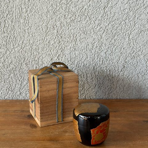 En forfinet lakkeret natsume-tekrukke dekoreret med elegant makie, der forestiller kimonoinspirerede mønstre. Designet har sarte blomsterdekorationer udført i guld mod en let drysset gyldengrund (nashiji), der fremkalder teksturen og atmosfæren i traditionelle japanske tekstilmønstre. Flydende bånd af guld og sort skaber en rytmisk komposition, der minder om kimono-stof, mens subtile røde detaljer tilføjer kontrast og dybde. Den afrundede form og den glatte lakfinish fremhæver det forfine håndværk, typisk for teceremonirråde/patoire. Både dekorativ og funktionel, indkapsler denne tekrukke den yndefulde æstetik i japansk lakværk og den poetiske skønhed i