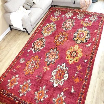 Tilføj varme, stil og autenticitet til dit hjem med dette håndknyttede Berber-tæppe fra Atlasbjergene i Marokko.