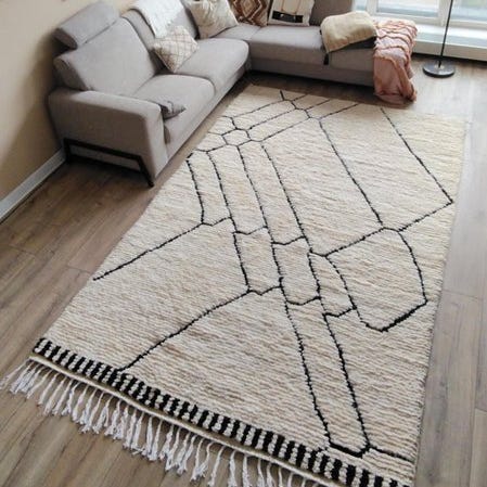 Hvert tæppe er nyt, unikt, lavet af 100% naturligt fåreuld – blødt, stærkt og fuldt bæredygtigt. Med sit moderne mønster giver dette tæppe et friskt blik på det klassiske Berberdesign. Mønsteret og formerne skaber harmoni og får tæppet til helt ubevidst at tiltrække opmærksomhed hos enhver besøgende.