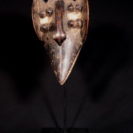 Guere-masken fra Côte d’Ivoire, udhugget træ med maling, dateret 1900–2000, 26 cm høj og 18 cm bred, cirka 0,41 kg, i god stand med små tegn på ældning. Klik på den blå "gå til varen" knap, for at købe eller byde på denne vare. Den samlede pris vil blive vist inden du afgiver dit bud.