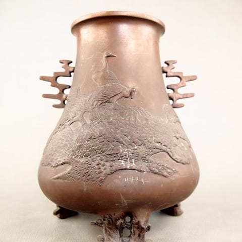 Refineret kobbervase fra Kuhodo 久芳堂, designet af Hirooka 廣陵, med indskrevet tomobako, med motiver af efterårsblade, fremstillet i Japan ved Dochu-hamere-teknikken; dimensioner 21,5 × 21,5 × 23 cm, i god brugt stand med tegn på brug. Klik på den blå "gå til varen" knap, for at købe eller byde på denne vare. Den samlede pris vil blive vist inden du afgiver dit bud.