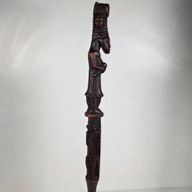 Træstol Bamileke fra Cameroun, højde 48 cm, bredde 38 cm, dybde 26 cm, god stand, 1 stk, materiale: træ, leveres uden stand. Klik på den blå "gå til varen" knap, for at købe eller byde på denne vare. Den samlede pris vil blive vist inden du afgiver dit bud.