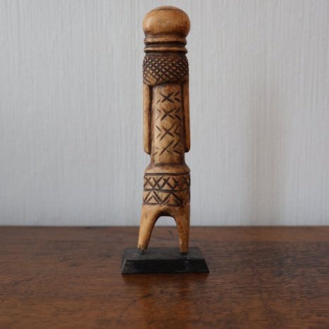 Mahongue vokterfigur fra Gabon, dateret til slutningen af det 20. århundrede, med træfod og kobber- og messingelementer, 47 cm høj, 12 cm bred, 15 cm dyb, vægt 1,2 kg, sælges med stativ. Klik på den blå "gå til varen" knap, for at købe eller byde på denne vare. Den samlede pris vil blive vist inden du afgiver dit bud.