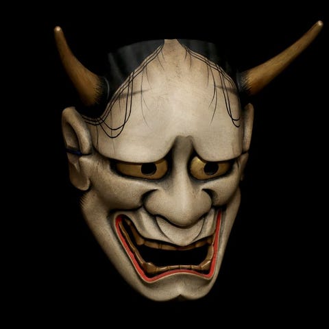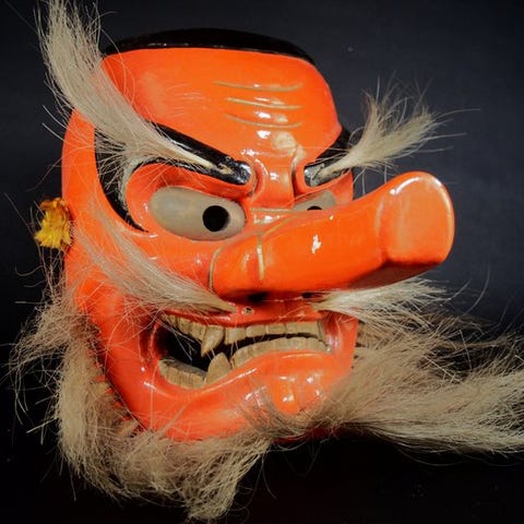 Signed Japan Wooden Noh Mask of Magogiro 能面 孫次郎 (with mask bag) - Skulptur Tr...