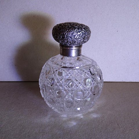 Dekorativ parfume-flaske af glas og 14 kt guld med krystal, fra 1900–1910; højde 12 cm, bredde 4 cm, dybde 1 cm, guldstemplet i form af egeblad. Klik på den blå "gå til varen" knap, for at købe eller byde på denne vare. Den samlede pris vil blive vist inden du afgiver dit bud.