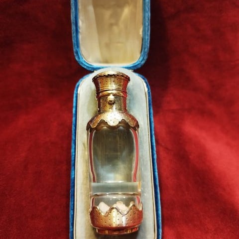 Smuk, dekorativ parfumeflaske. 585 (14 kt) guld, krystal. Guldstempel i form af et egetræblad.