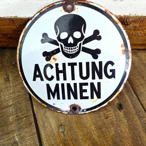 Skiltet er udført i rødt emajl med hvide bogstaver, en farvekombination der bliver brugt verden over for brandsikkerhed og nødsignalering. Takket være det enkle men kraftfulde design var skiltet let synligt og hurtigt genkendeligt.