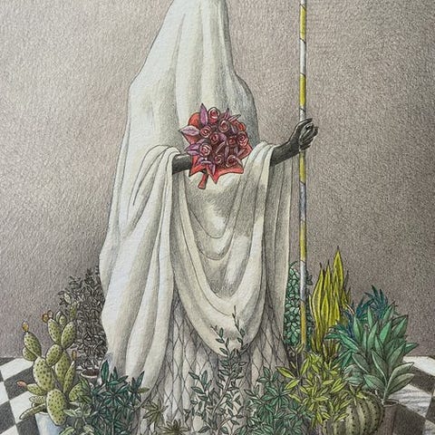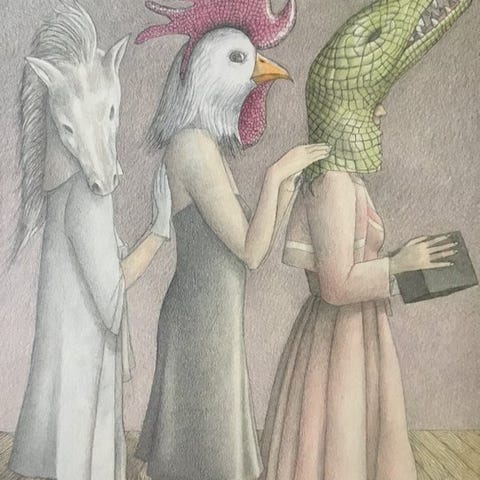 Denne tegning er en del af Ferruccio Nobiles symbolske figurative værk, hvor menneskelige figurer sameksisterer med dyr og drømmelignende landskaber. Kunstneren var dybt interesseret i forholdet mellem instinkt og identitet, og han brugte ofte dyr som metaforer for skjulte aspekter af menneskets natur.