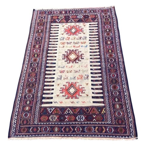 Kilimets design har et oplyst elfenbenscentralt felt, der huser en række symbolske motiver: