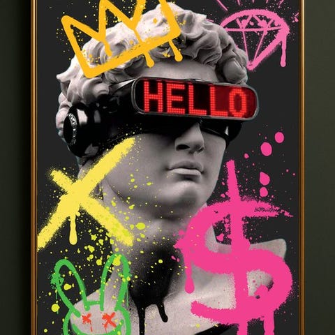 “Let That Shit Go V.1” er en eksplosiv fusion mellem klassisk kunst og nutidig ironi. Hovedpersonen, inspireret af renæssanceportrætter, holder med ekstrem ro en bunke toiletpapirruller, mens der på siden glimter den neonskulptur “LET THAT SHIT GO”, et dristigt slogan der forvandler det hellige til profant.