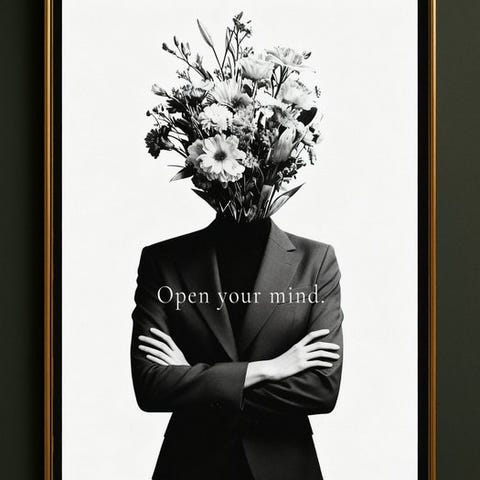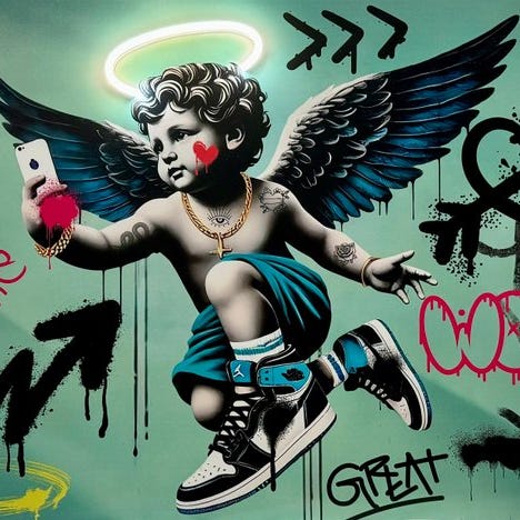 Konkurrencen mellem den elegante historiske billedes æstetik og budskabet i popkulturen skaber en visuel og konceptuel effekt, der trækker et smil, men også inviterer til at reflektere over værdien i at give slip på det, der tynger.