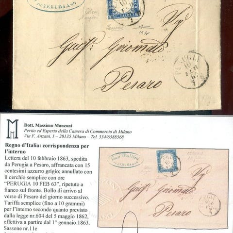 Brev fra Palermo til Trieste den 29. marts 1963, affranceret 1,55 lire med 40 centesimi «rosa» og 15 centesimi af sardinsk type. Smuk takst og flot kombination af værdi. Sammen udgør det meget interessant. Til en specialiseret samling. Certifikat Dr. M. Manzoni.